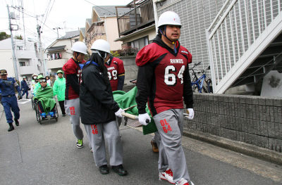 2012(平成24)年には、体育学部附属の「防災・救急救助総合研究所」を本学附置研究所として全学組織に拡大し、国内外における防災・救急救助に関する総合的研究に取り組んでいます。これら防災・救急に関する教育・研究環境の整備を踏まえ、国士舘は大学を地域の防災拠点として位置づけ、地元自治体との災害時の支援協定締結や消防・警察と定期的な合同訓練を実施するなどの連携強化を図っています。