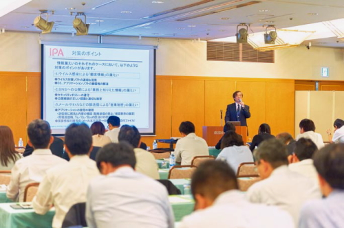 コンピュータウイルスや不正アクセスなど通常見ることがないコンピュータ画面上での不正な動作やその対策、実際に被害に遭ってしまった場合の相談先などをご紹介いただきました。また、組織及び個人で注意すべき情報漏えいの脅威について、ドラマ仕立てにした映像を交えてご説明いただきました。新入社員研修を受ける主人公が、組織で起こる情報漏えいのケース紹介とその対策、スマートフォンを安全に利用するためのセキュリティ対策を学ぶというものです。